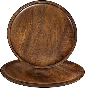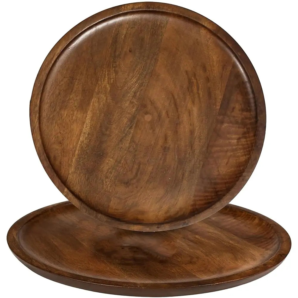 - 12"" Rustic Wooden Charger Plate Set Of 2, Handcrafted Matt Walnut Round Dinner Plates